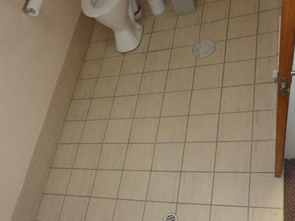 | Public bathroom with tiles and grout looking very dark and dirty |